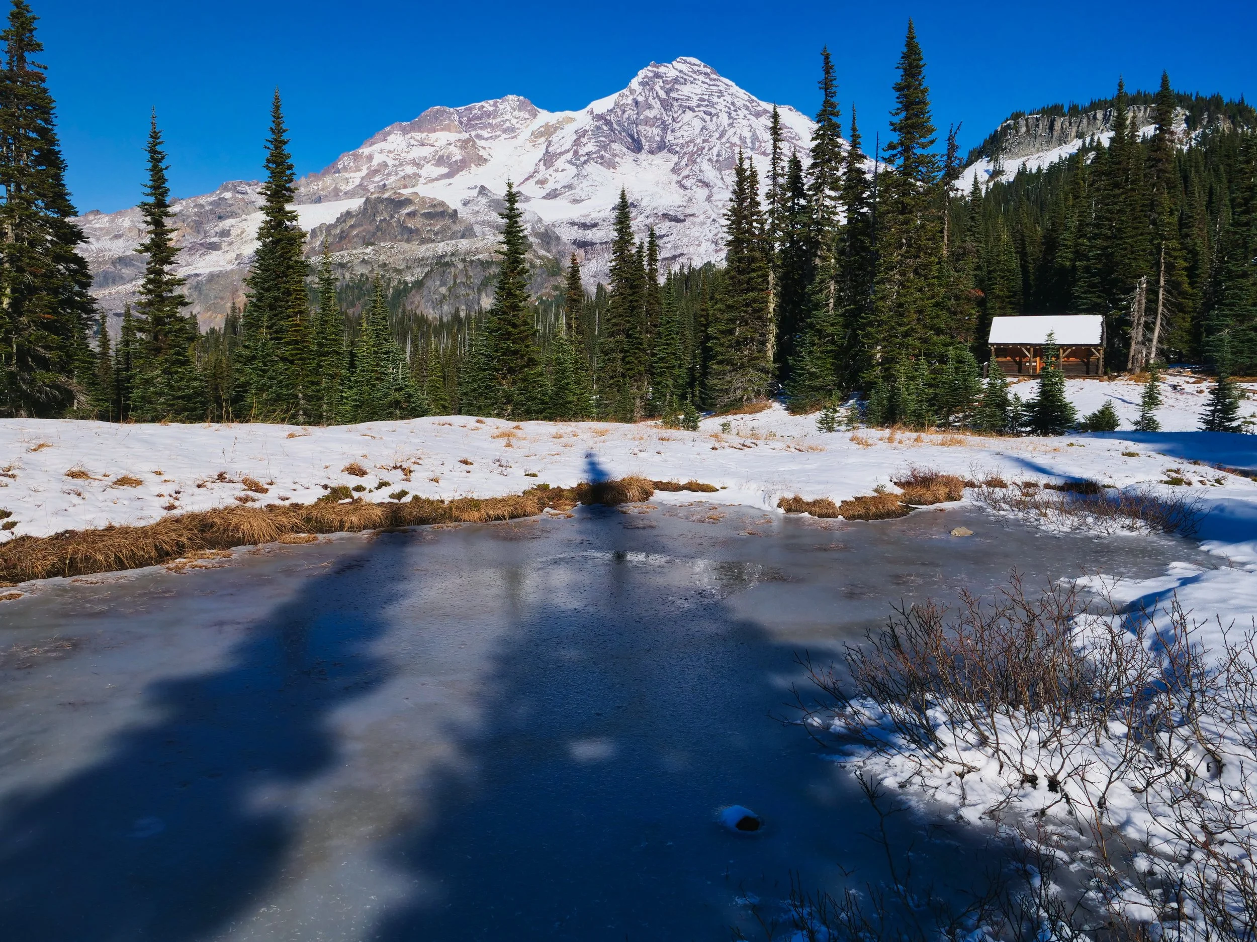 This was the last of my jaunts on Mt. Rainier’s west side back on October 30, 2023. I took advantage of clear weather following the season’s first snow to loop through Emerald Ridge. Starting at the Kautz Creek trail head, I did the short bike (6 miles) down the road to the West Side Road and secured the bike at the parking area. The remainder of the hike was on foot, hiking up the West Side Road to Round Pass and hopping on the Round Pass Trail to the South Puyallup Trail, intersecting the Wonderland. After checking out the sedate South Puyallup River, the Wonderland was the avenue to access Emerald Ridge. I was on snow for much of the day but it was never deep, and trail runners were more than adequate for the conditions. At Indian Henry’s I took the offshoot Kautz Creek trail back to my waiting van at the trail head. To close it out, a short drive to the West Side Road parking area had me retrieving my bike. A very fine day indeed. Stats: 26 miles (6 via bike) • 5,400’ elevation gain/loss.